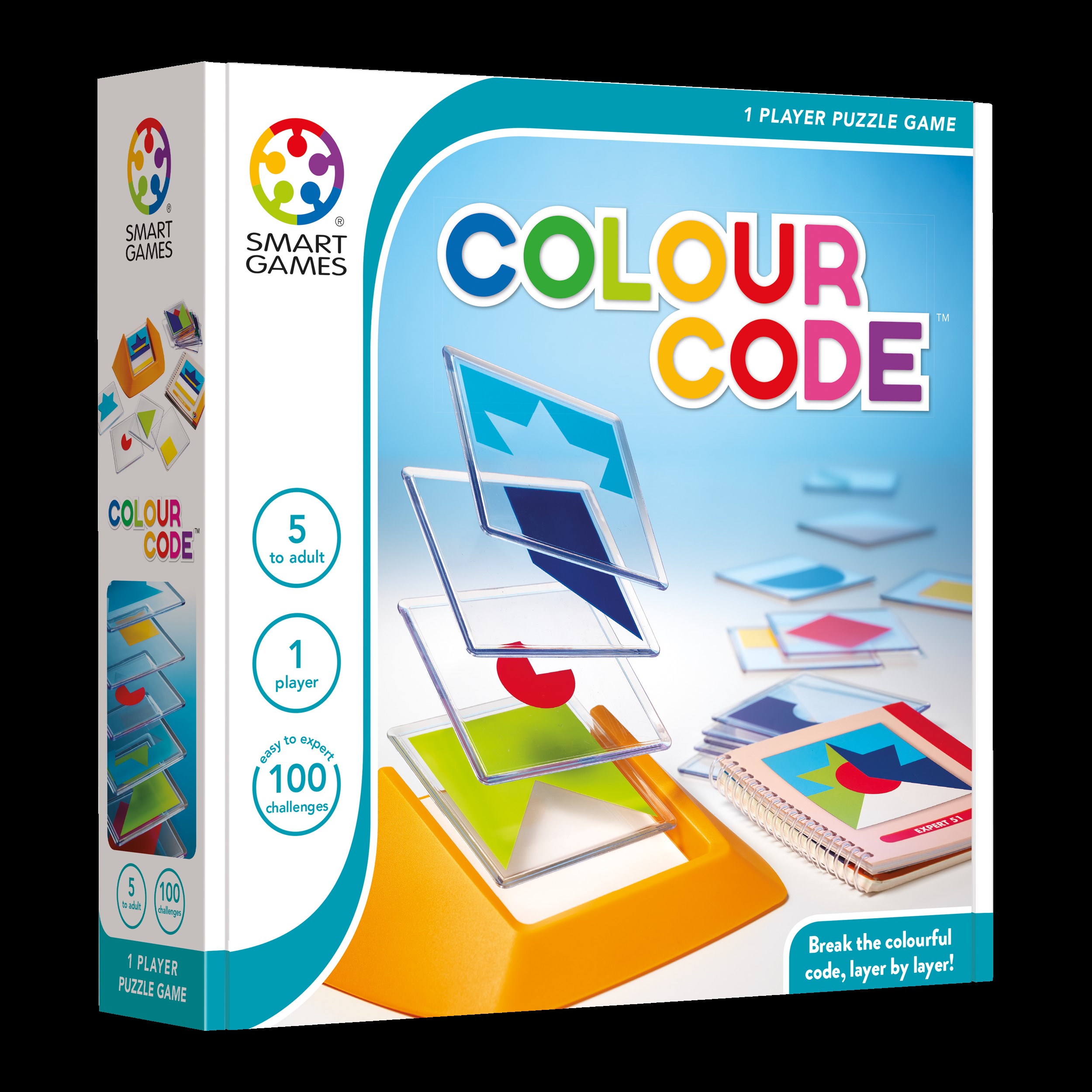 O código de cores usa 18 formas coloridas em negrito, cada uma em um ladrilho transparente. Escolha um desafio e empilhe um conjunto de peças para recriar a composição exata apresentada pelo seu desafio! Uma ótima introdução a cores, formas, ordem, orientação, etc.