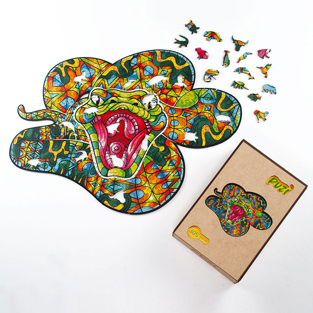Todas as suas peças possuem formatos diferenciados, oferecendo um quebra-cabeça diferente de tudo o que você já viu. Algumas das peças possuem formato de outros animais da fauna brasileira, e oferecem encaixes magníficos para deixar o desafio de montar o puzzle de madeira da cobra Anaconda muito mais emocionante.